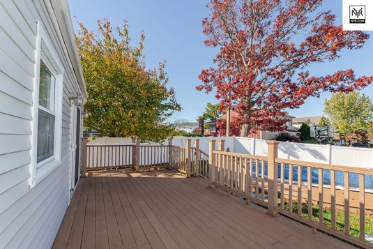 The huge backyard is enclosed with a maintenance-free white vinyl fence. The outdoor deck is accessible from the glass sliding doors off the kitchen/dining area. Further, there is a shed and above ground pool with deck.