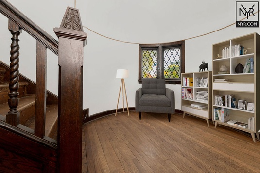 An impressive, oversized wood staircase which would leads up to the sleeping quarters on the second floor. The platform on the staircase, can be set up as library along with a chair for a quiet reading area (as shown in the staged photo). Here you will find three generously proportioned bedrooms, and two full bathrooms. The oversized primary bedroom has an ensuite. The primary bedroom can easily accommodate a king-size bed, large furniture, and a sitting area. This primary suite is thoughtfully split from the other two bedrooms, providing an enhanced sense of privacy and tranquility.