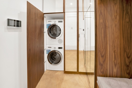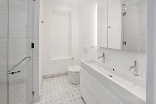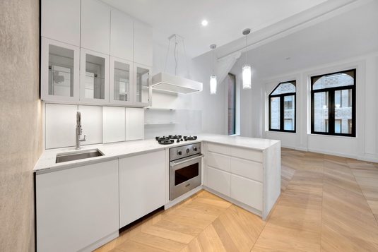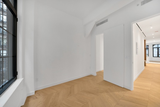 The residence features two bedrooms plus a versatile third room perfect as a home office, library, or guest suite. Interiors are entirely new and finished to a luxury standard, including a chef’s kitchen with Viking oven, Pitt gas burners, Bosch dishwasher, wine storage, and two spa-like marble bathrooms, one with a steam shower. Beautiful finishes throughout, including European white oak chevron floors. Additional comforts include private washer/dryer, central air conditioning, and elevator access directly to the floor, with a private elevator landing.