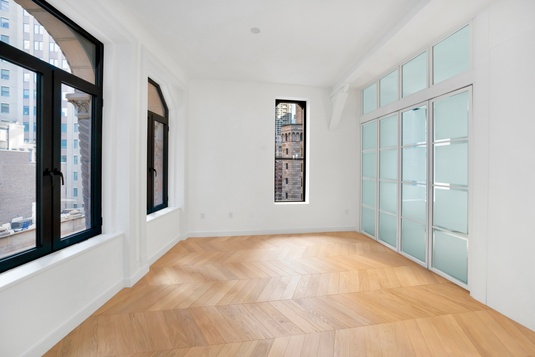 Set within the original Diamond Exchange of New York, this expansive high floor home offers soaring ceilings, exceptional light through historic bay windows, and an extraordinarily solid structure originally engineered to support diamond safes—ideal for grand furnishings, art collections, or a piano. The apartment has a beautiful view of historic facades in the Financial District.