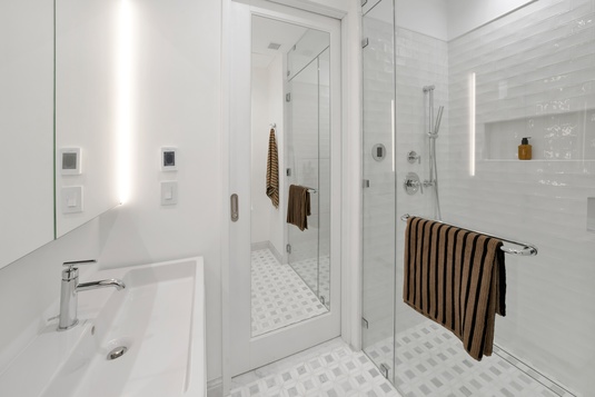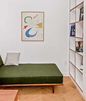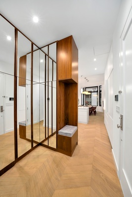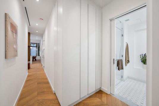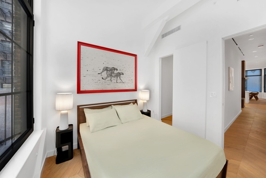 The residence features two bedrooms plus a versatile third room perfect as a home office, library, or guest suite. Interiors are entirely new and finished to a luxury standard, including a chef’s kitchen with Viking oven, Pitt gas burners, Bosch dishwasher, wine storage, and two spa-like marble bathrooms, one with a steam shower. Beautiful finishes throughout, including European white oak chevron floors. Additional comforts include private washer/dryer, central air conditioning, and elevator access directly to the floor, with a private elevator landing.