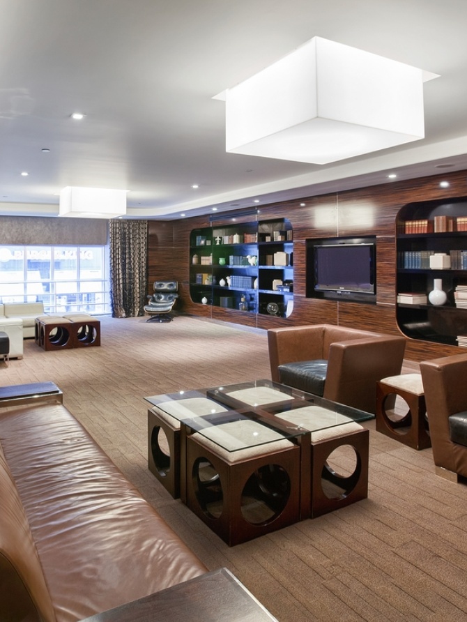 * Roof terrace with four lighted reflecting pools, cabanas, and chaise lounges
